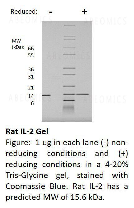 Biological Activity was determined by CTLL-2 Proliferation. at <=2 ng/mL; >= 5.0 x 10^5 units/mg. Centrifuge vial before opening, Suspend the product by gently pipetting the above recommended solution down the sides of the vial. DO NOT VORTEX. Allow several minutes for complete reconstitution. For prolonged storage, dilute to working aliquots in a 0.1% BSA solution, store at -80°C and avoid repeat freeze thaws. Upon reconstitution, a small amount of visible precipitate can be expected. A 10% overfill has been added to the total material vialed to compensate for this loss.