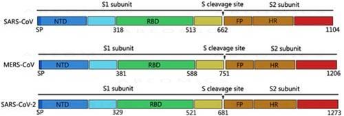 Structural diagrams of spike glycoproteins of SARS-CoV, MERS-CoV, and SARS-CoV-2. All spike proteins of coronaviruses contain S1 subunit and S2 subunit, which were divided by the S cleavage sites. FP, fusion peptide; HR, heptad repeat 1 and heptad repeat 2; RBD, receptor-binding domain, contains core binding motif in the external subdomain; SP, signal peptide. Adapted from Composition and divergence of coronavirus spike proteins and host ACE2 receptors predict potential intermediate hosts of SARS-CoV-2. Liu Z, et al. J Med Virol. 2020 Feb 26. doi: 10.1002/jmv.25726.