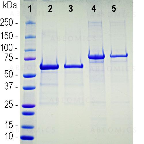 Figure-1: SDS-PAGE gel of recombinant human ACE2 virus binding region. Lane 1 shows protein molecular weight standards of apparent size indicated in kiloDaltons. Lanes 2 and 3 are 5.6μg and 2.8μg BSA and 4 and 5 are the ACE2 construct running at an apparent molecular weight about 70kDa, somewhat higher than the 63kDa predicted from the amino acid sequence. This discrepancy is likely due to the highly acidic nature of the protein. The protein was expressed in E. coli and extracted from inclusion bodies using 6M urea.