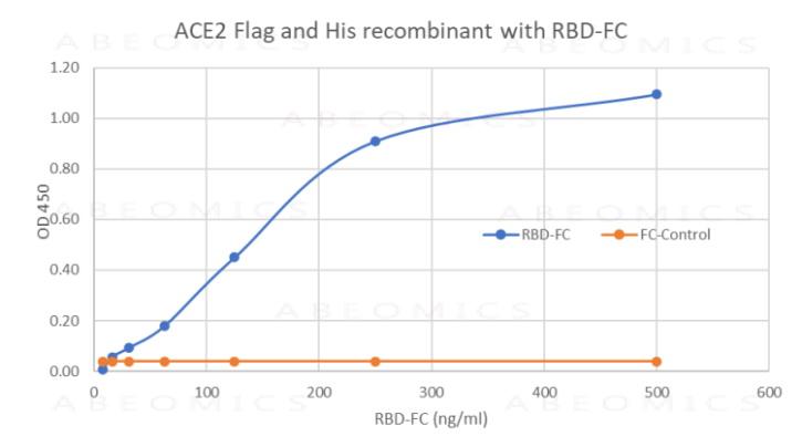 Figure 1 : Recombinant Human ACE2 His and FLAG Tag (21-1006) binds with high affinity to the Spike (RBD) protein of the virus SARS-CoV-2. Method: Recombinant Human ACE2 His and FLAG Tag (21-1006) is coated on an ELISA plate at 1 ug/ml overnight at 4°C. Recombinant SARS-Cov-2 Spike RBD Protein Fc Tag (319-541 aa) is added (starting at a concentration of 500 ng/ml with a two fold serial dilution) incubated one hour at RT. The interaction is then detected using an anti-human IgG (HRP).
