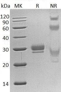 Fig 1: SDS-PAGE analysis of Recombinant Human CTHRC1/NMTC1 (C-6His) 293 HEK cells. R lane is in reducing conditions, NR for non-reducing.