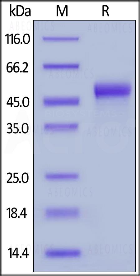 Fig.1: Human Galectin-9, His Tag on SDS-PAGE under reducing (R) condition. The gel was stained overnight with Coomassie Blue. The purity of the protein is greater than 95%.