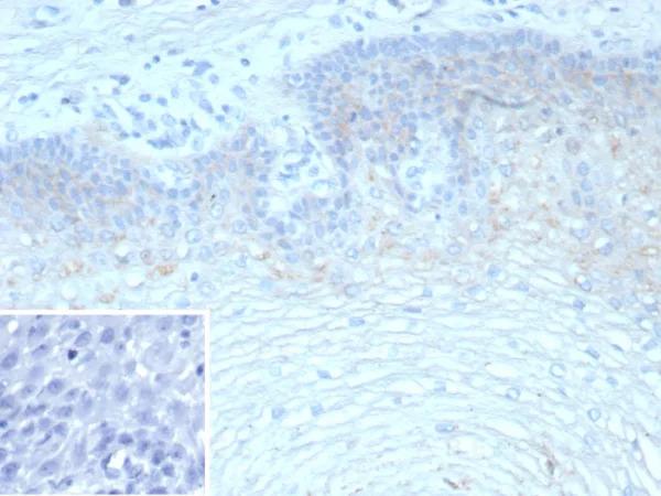 Figure 1: Formalin-fixed, paraffin-embedded human esophagus stained with TRIM29 Recombinant Rabbit Monoclonal Antibody (TRIM29/9257R). Inset: PBS instead of primary antibody; secondary only negative control.