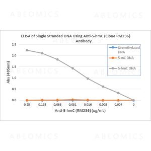 Clone RM236 reacts to 5-hydroxymethylcytosine in both single-stranded and double-stranded DNA. No cross reactivity with non-methylated cytosine and methylcytosine in DNA. Dot Blot: 0.2 µg/ml – 1 µg/ml; ELISA: 0.1 µg/ml - 1 µg/ml; IHC: 0.1 µg/ml - 1 µg/ml; ICC: 0.5 µg/ml- 2 µg/ml; hMeDIP: 0.2 µg/ml- 2 µg/ml.