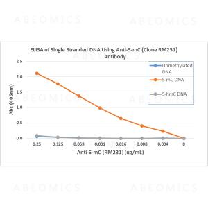 Clone RM231 reacts to 5-methylcytosine in both single-stranded and double-stranded DNA. No cross reactivity with non-methylated cytosine and hydroxymethylcytosine in DNA. Dot Blot: 0.5 µg/ml – 2 µg/ml; ELISA: 0.1 µg/ml - 1 µg/ml; ICC: 0.5 µg/ml - 2 µg/ml; MeDIP: 0.2 µg/ml- 2 µg/ml.