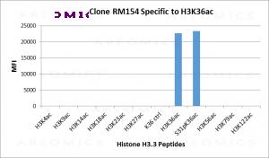Clone RM154 reacts to Histone H3 acetylated at Lysine 36 (K36ac), and is not affected by the phosphorylation of neighboring Ser31. No cross reactivity with other acetylated Lysines in histone H3. Western Blot: 0.5 µg/ml - 2 µg/ml; ICC: 0.5 µg/ml - 2 µg/ml; ELISA: 0.2 µg/ml - 1 µg/ml; Multiplex: 0.1 µg/ml – 0.5 µg/ml.