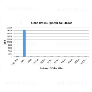 Figure 1: Clone: RM149 specifically reacts to Histone H3 acetylatedat Lysine 4 (K4ac). No cross reactivity with non-modified Lysine 4, acetylated Lysine 9 (K9ac), Lysine14 (K14ac), Lysine 18 (K18ac),Lysine 23 (K23ac), Lysine 27 (K27ac), Lysine 36 (K36ac), Lysine 56 (K56ac), lysine 79 (K79ac), or Lysine 122 (K122) in histone H3.