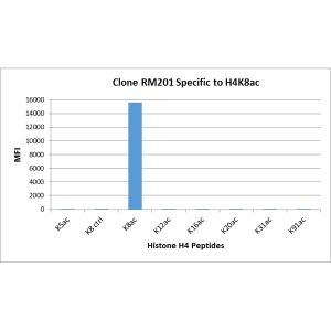 Clone RM201 reacts to Histone H4 acetylated at Lysine 8 (K8ac). No cross reactivity with other acetylated Lysines in Histone H4. Western Blot: 0.5 µg/ml - 2 µg/ml; ELISA: 0.2 µg/ml - 1 µg/ml; Multiplex: 0.05 µg/ml – 1 µg/ml; Immunocytochemistry: 0.5 µg/ml- 2 µg/ml.