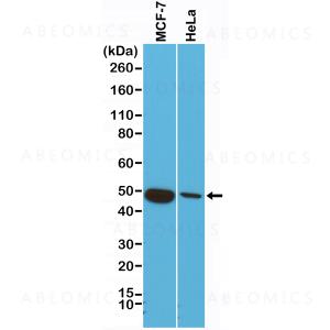 Figure 1: Western Blot of MCF-7 and HeLa cells lysates using Anti-CK18 Rabbit Monoclonal Antibody (Clone: RM279) at a 1:1000 dilution.