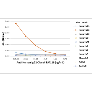 Clone RM118 reacts to the heavy chain of human IgG2. No cross reactivity with human IgG1, IgG3, IgG4, IgM, IgA, IgD, IgE, mouse IgG, rat IgG, or goat IgG. ELISA: 50ng/well – 200ng/well (for Capture); 0.05 µg/ml – 0.2 µg/ml (for Detection); Immunocytochemistry (ICC): 0.5 µg/ml-2 µg/ml; Immunohistochemistry (IHC): 0.5 µg/ml-2 µg/ml.