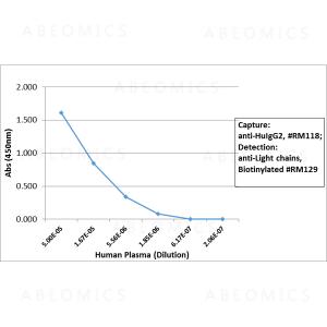 Figure 1: Sandwich ELISA using Clone: RM118 as the capture antibody, and Biotinylated anti-human light chains(Kappa+ Lambda) antibody Clone: RM129 as the detection antibody, followed by an AP conjugated streptavidin.