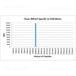 Clone RM167 reacts to Histone H3 monomethylated at Lysine 18 (K18me1). No cross reactivity with nonmodified Lysine 18 or dimethylated Lysine 18 (K18me2), or other methylations in histone H3. Western Blot: 1 µg/ml – 2 µg/ml; ELISA: 0.2 µg/ml - 1 µg/ml; Multiplex: 0.1 µg/ml – 0.5 µg/ml.