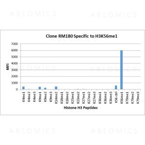 Clone RM180 reacts to Histone H3 monomethylated at Lysine 56 (K56me1). No cross reactivity with nonmodified Lysine 56 or other methylations in histone H3. Western Blot: 1 µg/ml – 2 µg/ml; ELISA: 0.2 µg/ml - 1 µg/ml; Multiplex: 0.1 µg/ml – 0.5 µg/ml.