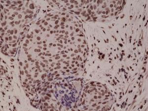 Figure 1: Immunohistochemical staining of formalin fixed and paraffin embedded human breast cancer tissue sections using Anti-Phospho-p38 MAPK (Thr180/Tyr182) Clone: RM243 at a 1:1000 dilution.