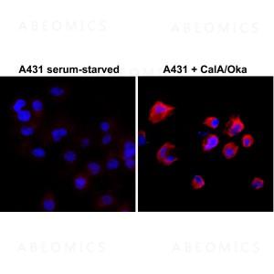 Figure 1: Immunocytochemistry of serum-starved A431 cells nontreated or treated with Calyculin A/Okadaic Acid, using Clone: RM102 at 1/500 dilution (followed by PE conjugated secondary antibody, red) and DAPI (blue).