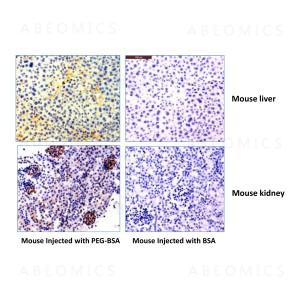 Figure 1: Immunohistochemistry of mouse liver and kidney using 0.5 µg/ml of anti-PEG Clone: RM105. The mouse was injected with PEG-BSA or BSA for 3 hours before sampling.