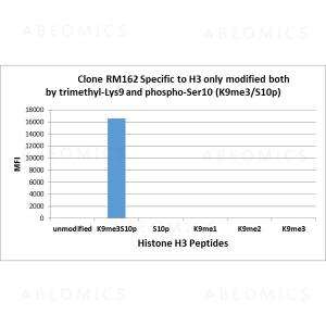Figure 1: Clone: RM162 specifically reacts to Histone H3 only when modified by both trimethylation at lysine 9 and phosphorylation at serine 10 (K9me3/S10p). No cross reactivity with non-modified Lysine 9/ Serine 10,methylated Lysine 9 (K9me1, k9me2, k9me3) ONLY, or phosphorylation at Serine 9 ONLY in Histone H3.