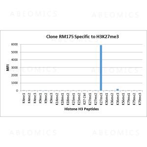 Clone RM175 reacts to Histone H3 trimethylated at Lysine 27 (K27me3). No cross reactivity non-modified Lysine 27, monomethylated Lysine 27 (K27me1) or dimethylated Lysine 27 (K27me2), or other methylations in histone H3. Western Blot: 1 µg/ml – 2 µg/ml; IHC: 0.5 µg/ml – 2 µg/ml; ELISA: 0.5 µg/ml - 1 µg/ml; Multiplex: 0.1 µg/ml – 0.5 µg/ml.