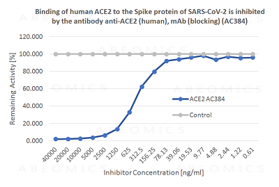 Figure-1: Binding of human ACE2 to the Spike protein of SARS-CoV-2 is inhibited by anti-ACE2 (human), mAb (blocking) (AC384) Azide free (Cat No# 29-1005).