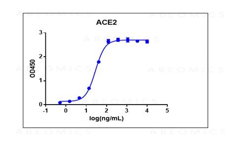ELISA. SARS-CoV-2 Spike protein (RBD, His Tag) can bind with Human ACE2 in functional ELISA assay.