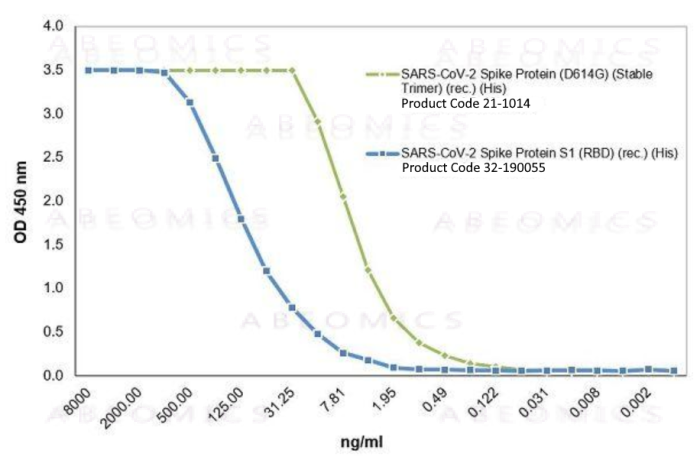Figure 1: Full-length trimeric SARS-CoV-2 Spike (Cat. No. 21-1014) binds to its receptor, Human ACE2 Protein, FLAG Tag (Cat. No. 32-190010), with high affinity. Method: SARS-CoV-2 Spike S1 D614G Stable Trimer Recombinant His Protein (Cat. No. 21-1014) or SARS-CoV-2 Spike Protein S1 RBD recombinant His protein (Cat. No. 32-190055) are coated at 50nM overnight at 4°C. Human ACE2 Protein, FLAG Tag (Cat. No. 32-190010) is added (starting at a concentration of 8000 ng/ml with a twofold serial dilution) during one hour at RT and the interaction is then detected using an anti-Flag (HRP).
