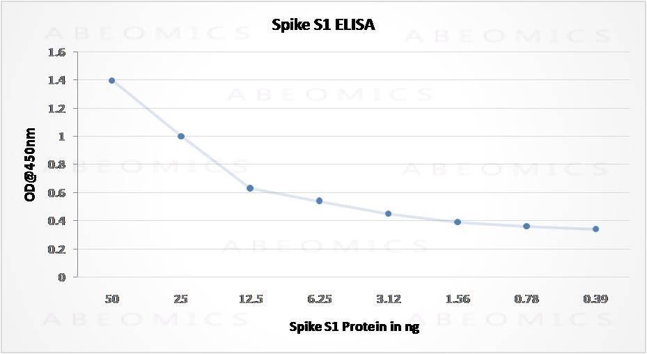 Figure-1: The Sandwich ELISA was carried out by coating the 96 well plate with 200 ng/well of ABM1H9.1E6 (Cat#10-10039) monoclonal antibody. The Mammalian expressed full-length SARS-CoV-2 Spike S1 protein (21-1008) was serially diluted from 50 ng to 0.39 ng in triplicates across rows. The (11-2009) polyclonal antibody (200 ng/well ) was used as detection antibody. Goat Anti-rabbit HRP was used as secondary antibody.