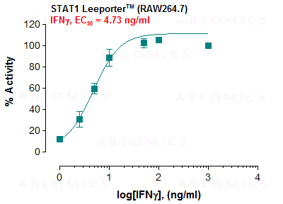 The STAT1 Leeporter™ Luciferase Reporter cell line is a stably transfected RAW264.7 cell line which expresses Renilla luciferase reporter gene under the transcriptional control of the interferon (IFN) gamma activation sequence-based STAT1 response element, so that the cell line is designed to measure the transcriptional activity of STAT1. As a transcription factor, Signal Transducer and Activator of Transcription 1 (STAT1) is activated through phosphorylation at tyrosine 701 in response to various cytokines and growth factors such as IFN-alpha, IFN-gamma, IL-6, EGF and PDGF. The phosphorylated STAT1 forms homodimers or heterodimers with STAT3, and the dimers translocate to nucleus in which DNA binding/promoter induction occurs. The STAT1 induction by IFN-gamma is shown in Figure 1.