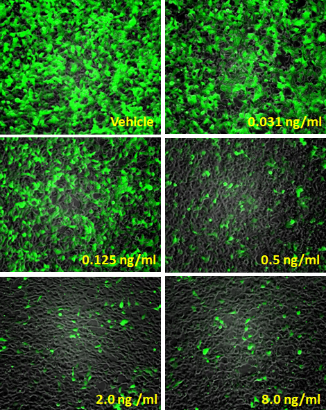 Fig-1: GFP suppression in TET-OFF Leeporter™ GFP reporter-HEK293 cells was analyzed by fluorescence microscopy. Doxycycline was treated at different concentrations as noted.