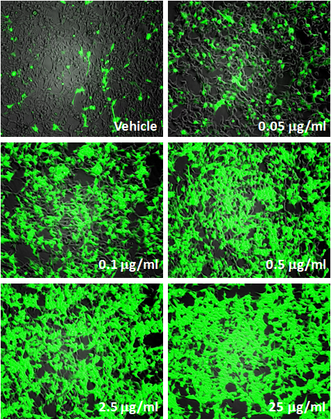 Fig-1: Induction of TLR3 activity by Poly(I:C) in TLR3/NF-kB Leeporter™ GFP reporter-HEK293 cells was analyzed by fluorescence microscopy. Poly(I:C) was treated at 0.05, 0.1, 0.5, 2.5 and 25 ug/ml as noted.