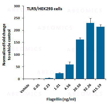 TLR5/HEK293 Stable Cell Line is a stably transfected HEK293 cell line which expresses human Toll-like receptor 5 (TLR5, also designated as CD285). TLR5 mediates immune responses by recognition of bacterial flagellin, of which activation involves in various human diseases including inflammatory bowel disease, rheumatoid arthritis, osteoclastogenesis, gastric cancer, cervical cancer and ovarian cancer. Note that TLR5 in the TLR5/HEK293 stable cell line contains the N-terminal HA tag (Figure 2), which does not interfere with TLR5 activity as confirmed by functional assay (Figure 1).