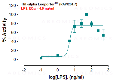 The TNF-alpha Leeporter™ Luciferase Reporter cell line is a stably transfected RAW264.7 cell line which expresses Renilla luciferase reporter gene under the transcriptional control of the TNF-alpha promoter. Tumor necrosis factor-alpha (TNF-alpha) is one of the major proinflammatory cytokines and can induce systemic inflammation, apoptotic cell death, sepsis and cachexia. Dysregulation of TNF-alpha induction is often involved in various human diseases including inflammatory bowel disease, cancer and Alzheimer's disease. The TNF-alpha induction by lipopolysaccharide (LPS), the Toll-like receptor 4 (TLR4) ligand, is shown in Figure 1.